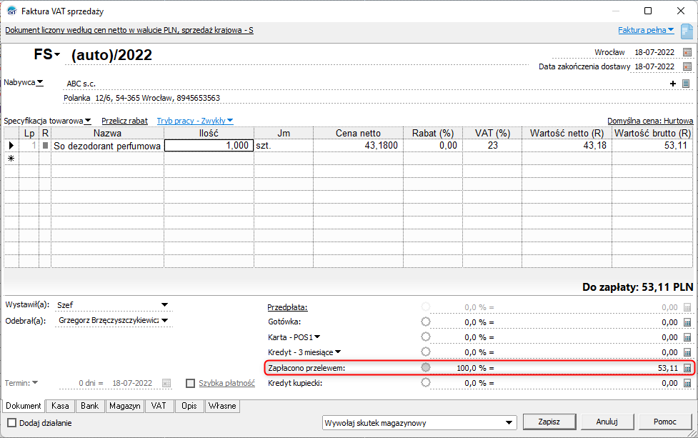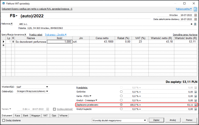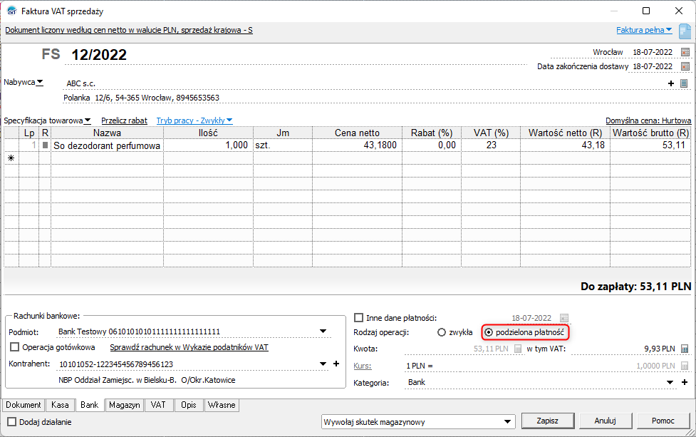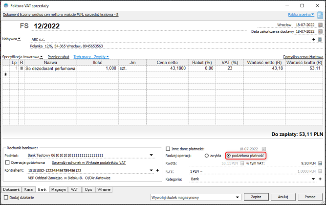 Dodając fakturę sprzedaży, użytkownik może od razu zaewidencjonować wpłatę bankową wykorzystującą mechanizm podzielonej płatności. W tym celu w dokumencie należy wybrać formę płatności Zapłacono przelewem, a następnie na zakładce Bank zaznaczyć opcję Podzielona płatność.