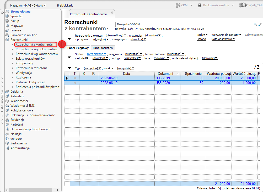 1. Przejść do modułu Rozrachunki, a następnie dowolnego modułu związanego z rozliczaniem rozrachunków (np. Rozrachunki z kontrahentem).