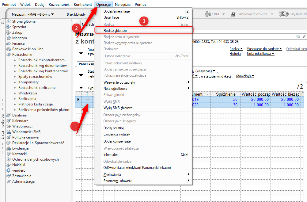 2. Wskazać wybrane rozrachunki, a następnie wybrać opcję Operacje – Rozlicz zbiorczo.