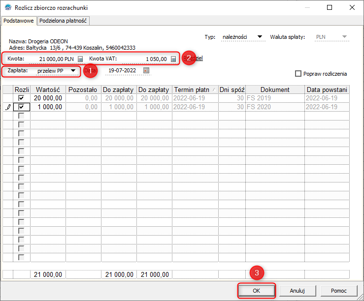 3. Jako zapłatę wskazać przelew PP, wprowadzić kwotę przelewu oraz Kwotę VAT, po czym zaznaczyć rozrachunki i zatwierdzić przyciskiem OK.