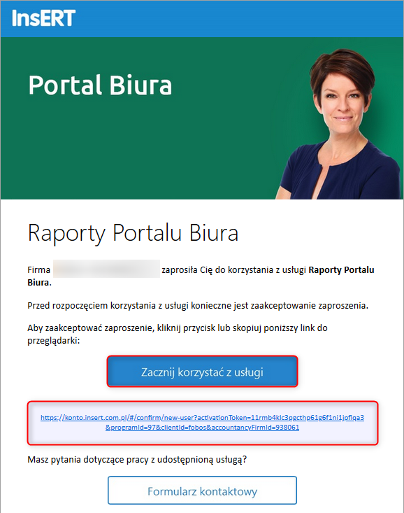 UWAGA!! W przypadku posiadania Konta InsERT przed kliknięciem przycisku Zacznij korzystać z usługi należy sprawdzić, czy użytkownik jest zalogowany do poprawnego Konta InsERT na stronie www.konto.insert.com.pl. Konto InsERT akceptujące zaproszenie musi posiadać uprawnienia Administratora firmy. Po kliknięciu Zacznij korzystać z usługi klient poczty powinien uruchomić domyślną przeglądarkę internetową. Jeśli jednak tak się nie stanie należy skopiować link, który znajduje się na dole wiadomości, a następnie wkleić go ręcznie w przeglądarce.