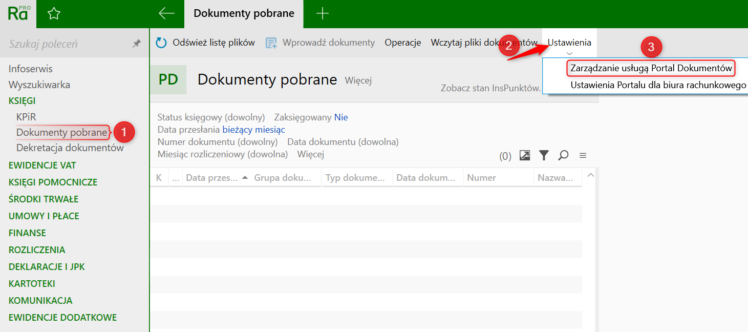 2. Przejść do modułu Dokumenty pobrane, kliknąć górne menu Ustawienia i wybrać Zarządzanie usługą Portal Dokumentów.