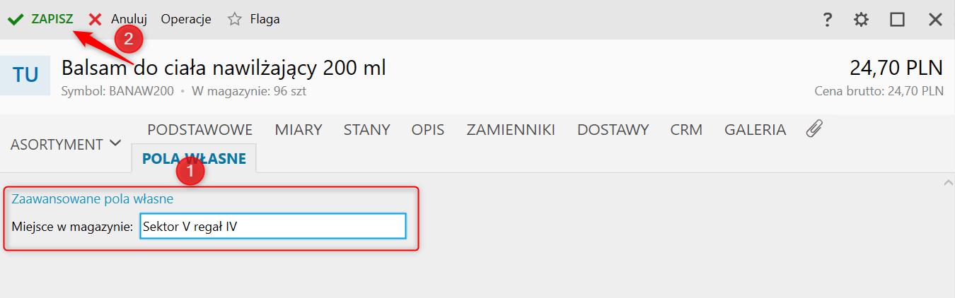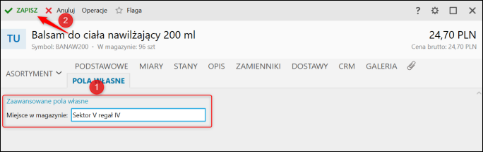 4. Aby wykorzystać stworzone pole własne, należy przejść do kartoteki obiektu, do którego było stworzone pole i na zakładce Pola własne wprowadzić do niego wartość.