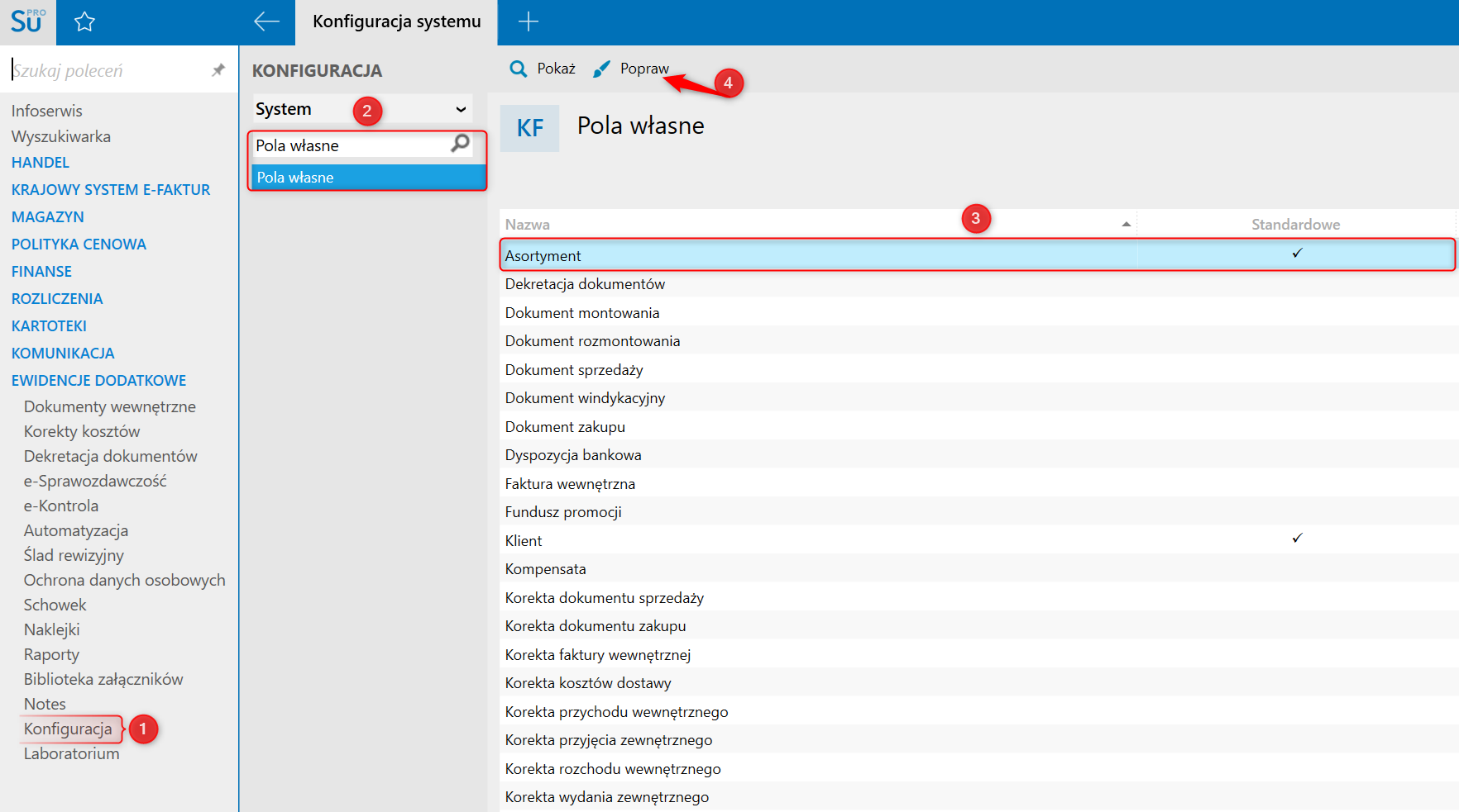 1. Przy użyciu wyszukiwarki w lewym górnym rogu programu znaleźć i uruchomić moduł o nazwie Pola własne. Następnie zaznaczyć słownik konfiguracji pól obiektów, które będą miały dodane pola własne i kliknąć przycisk Popraw.