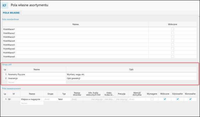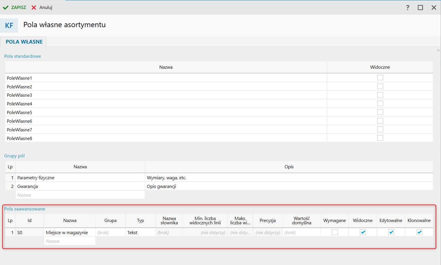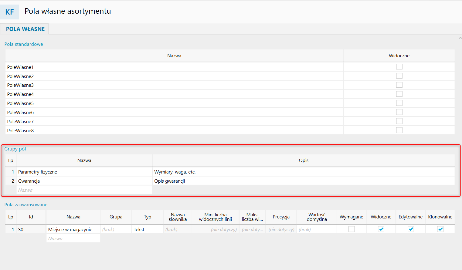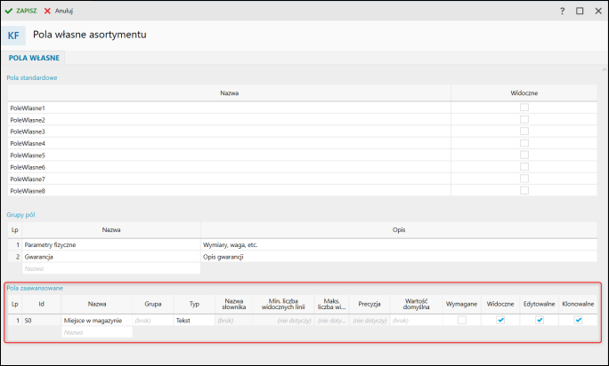 Uwaga! Zaawansowane pola własne są dostępne tylko dla posiadaczy licencji na program InsERT nexo PRO.