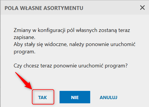 3. Dodanie zaawansowanych pól własnych wymaga modyfikacji bazy danych. Po próbie zapisania na ekranie pojawią się komunikaty, z którymi należy się zapoznać i właściwie na nie odpowiedzieć.