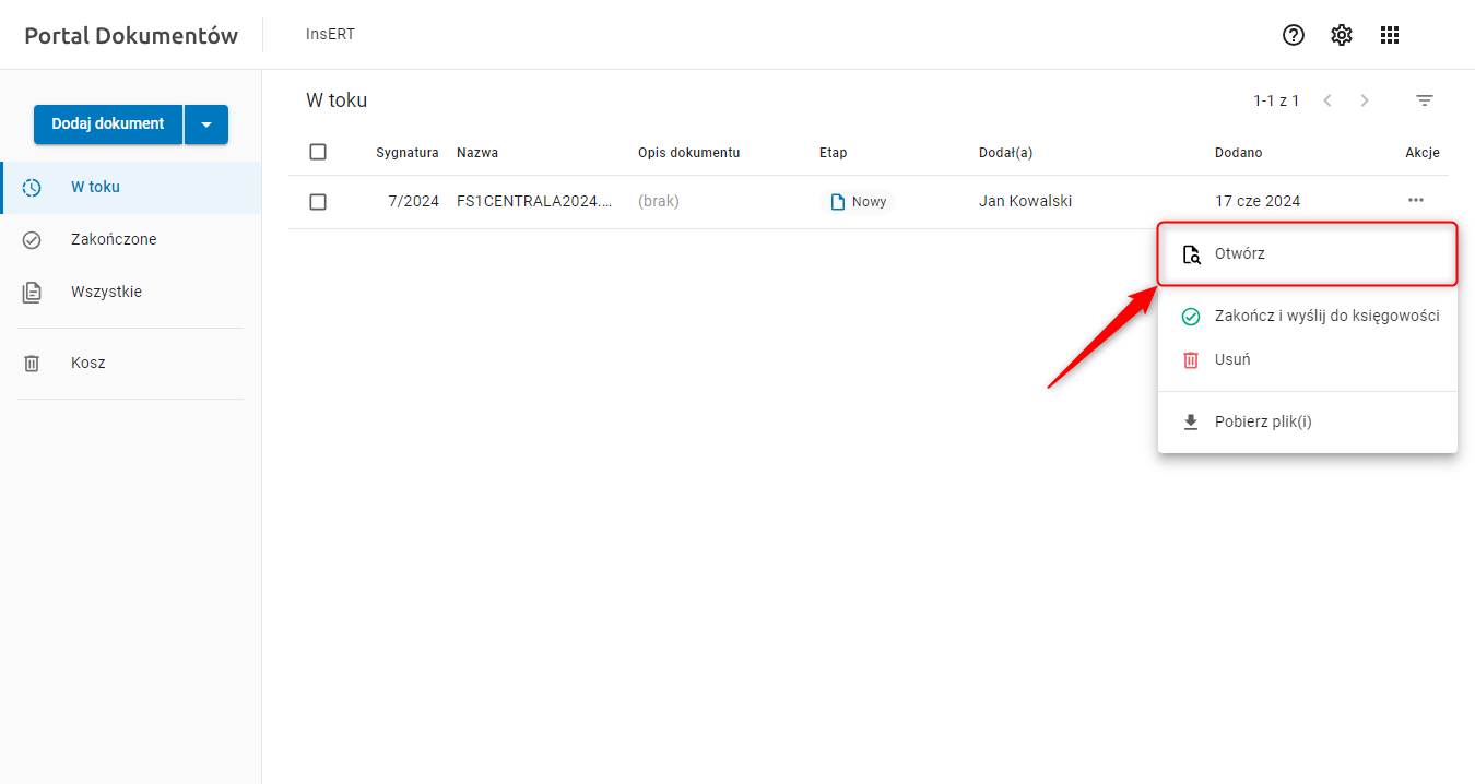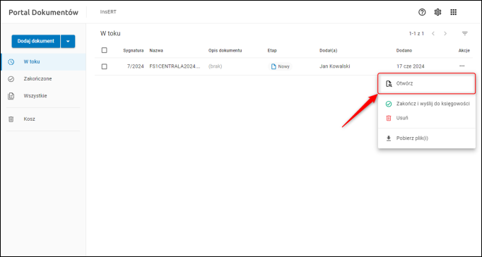 1. W Portalu Dokumentów przejść na listę dokumentów W toku i wybrać Akcje – Otwórz.