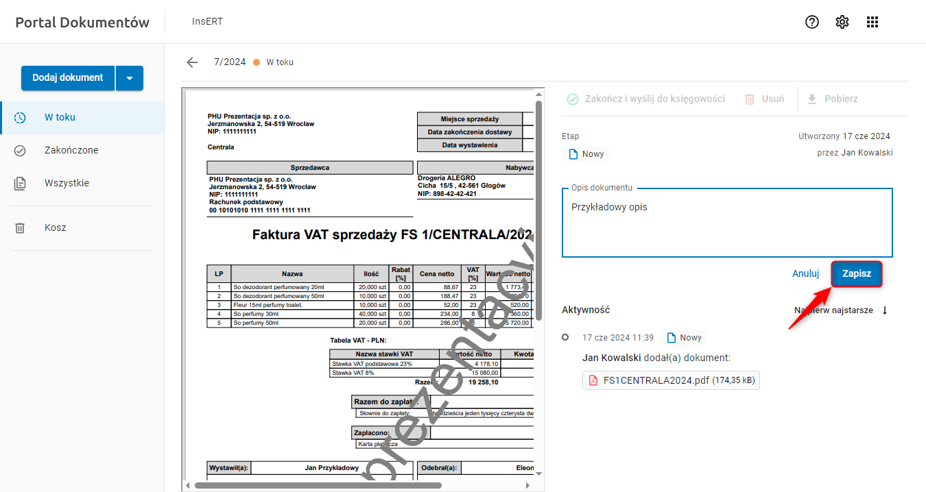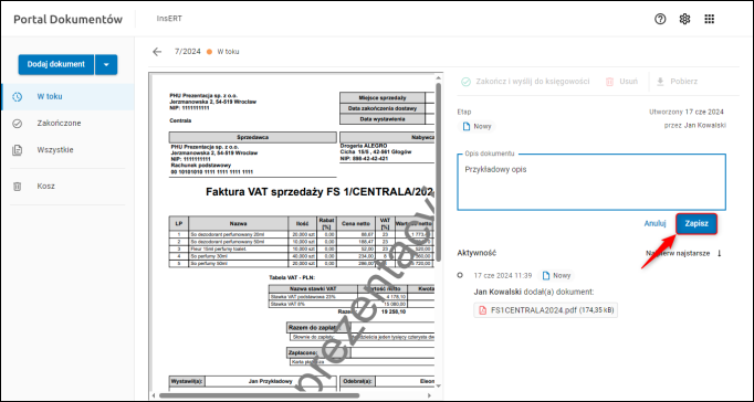 2. Wprowadzić wartość w polu Opis dokumentu i zatwierdzić przyciskiem Zapisz.