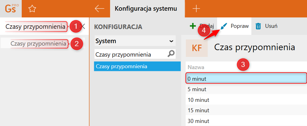 Aby to zrobić, należy w lewym, górnym rogu programu, w wyszukiwarce wpisać Czasy przypomnienia, wejść w wyszukany moduł, wybrać czas przypomnienia i kliknąć górne menu Popraw.