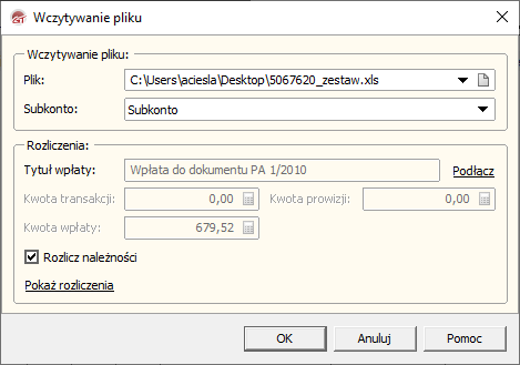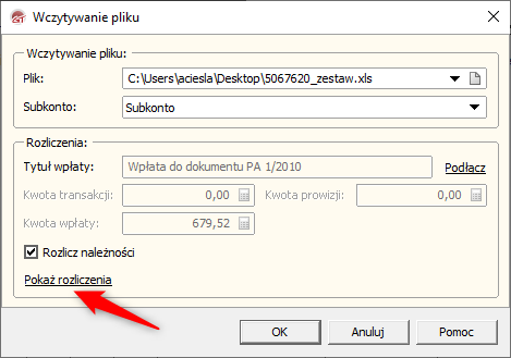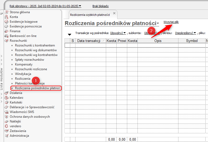 1. Otworzyć moduł Rozrachunki – Rozliczenia pośredników płatności i wybrać opcję Wczytaj plik.