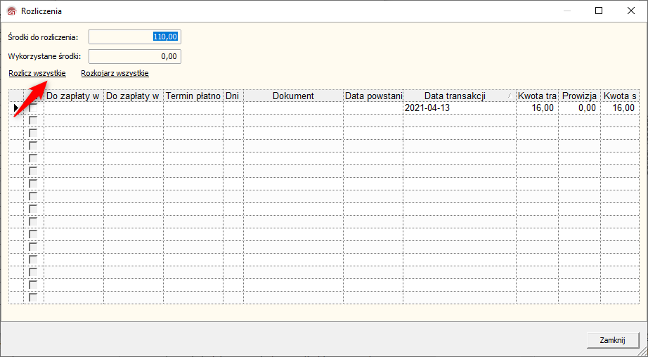 5. W nowym oknie program wyświetli listę transakcji wczytanych z pliku, wartość ich rozliczenia (na podstawie kwoty transakcji z pliku) oraz wyliczoną proporcjonalnie kwotę prowizji. Użytkownik może wykorzystać opcję Rozlicz wszystkie, aby zaznaczyć wszystkie operacje automatycznie. Po zaznaczeniu operacji zatwierdzić rozliczenie przyciskiem OK.