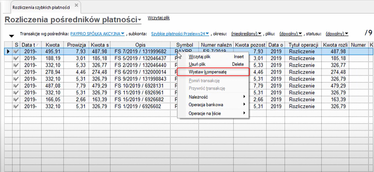 6. Efektem wykonania rozliczenia za pomocą pliku CSV jest częściowe rozliczenie należności na operatora szybkich płatności (Przelewy24). Pozostała część należności to prowizje od transakcji, które należy skompensować z fakturą wystawioną przez Przelewy24 (użytkownik może ją wprowadzić jako fakturę zakupu lub zobowiązanie). Aby wprowadzić kompensatę, użytkownik musi zaznaczyć rozliczenia, których dotyczy faktura. Z modułu Rozliczenia pośredników płatności kliknąć dowolną z zaznaczonych pozycji prawym przyciskiem myszy i wybrać opcję Wystaw kompensatę.
