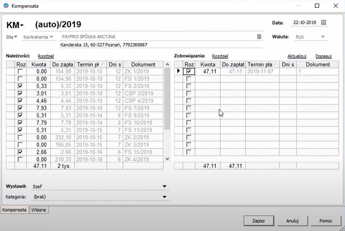 7. W oknie kompensaty program automatycznie zaznaczy należności do skompensowania. Użytkownik musi wskazać zobowiązanie powstałe z faktury otrzymanej od Przelewów24 i zapisać kompensatę. Po zapisaniu kompensaty program zaproponuje zrealizowanie kompensaty z bieżącą datą. Zatwierdzenie tej operacji skutkuje zakończeniem rozliczenia szybkich płatności.