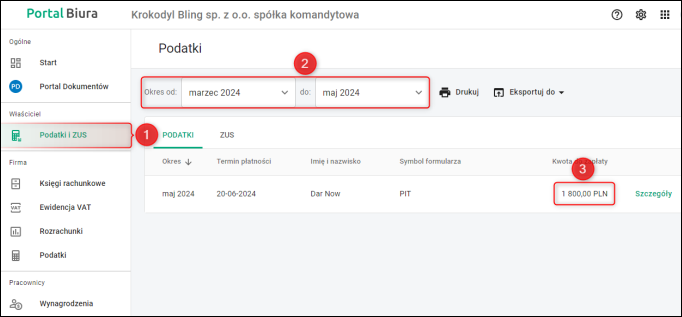 2. Alternatywnie można przejść do modułu Podatki i ZUS i odpowiednio ustawić filtry Okres od/do. W kolumnie Kwota do zapłaty będzie widać odpowiednio kwoty dla wszystkich naliczonych w podany m okresie zaliczek PIT.