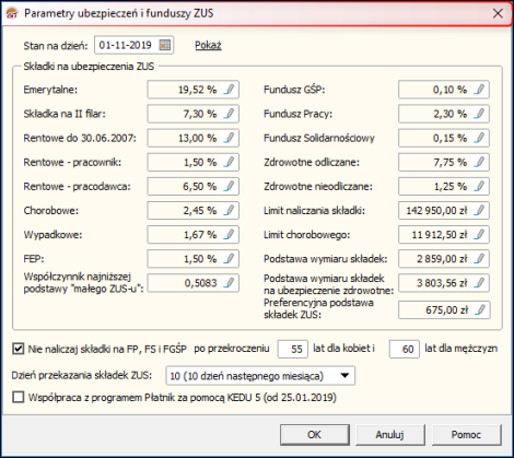 3. W oknie ubezpieczeń i funduszy ZUS użytkownik może zweryfikować parametry na dany dzień. Aby edytować wartości, należy wybrać ikonę ołówka obok zdefiniowanej wartości.