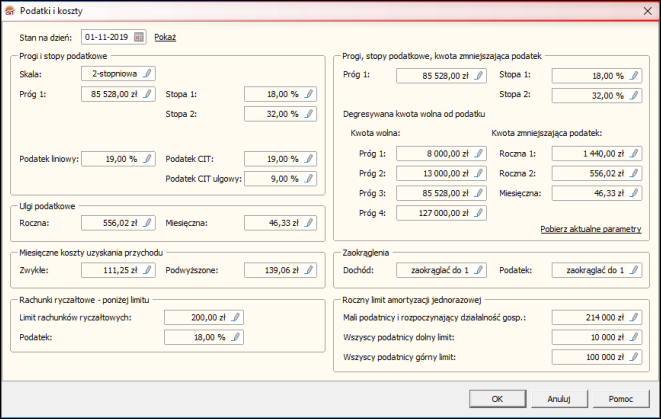 3. W oknie Podatki i koszty, w poszczególnych sekcjach, można ustalić wartość progów i stóp podatkowych, ulg podatkowych oraz sposób zaokrąglania dochodu i podatku. Użytkownik może zweryfikować parametry na dany dzień.