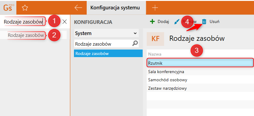 Aby to zrobić, należy w lewym, górnym rogu programu, w wyszukiwarce wpisać Rodzaje zasobów, wejść w wyszukany moduł, zaznaczyć Rodzaj zasobu i kliknąć górne menu Usuń.
