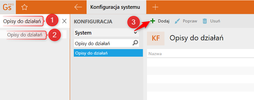 Aby to zrobić, należy w lewym, górnym rogu programu, wyszukiwarce wpisać Opisy do działań, wejść w wyszukany moduł i kliknąć górne menu Dodaj.