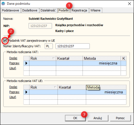 1. W głównym menu Podmiot, w pozycji Dane podmiotu w zakładce Podatki należy zaznaczyć opcję Podatnik VAT zarejestrowany w UE.