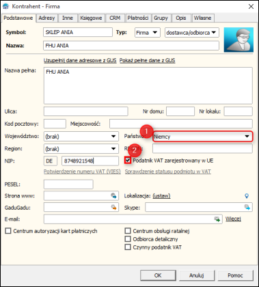 2. Niezbędne jest również, aby kontrahent, dla którego wystawiany jest dokument, posiadał wybrane odpowiednie państwo oraz zaznaczony parametr Podatnik VAT zarejestrowany w UE.