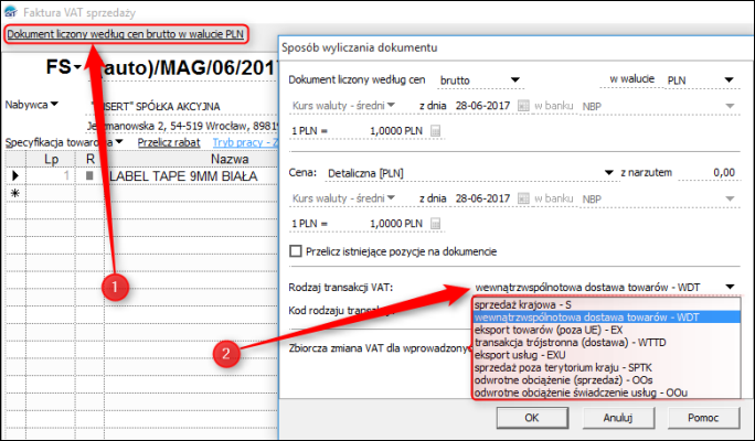 3. W konkretnej fakturze należy ustawić prawidłową wewnątrzunijną transakcję VAT – w otwartym do edycji dokumencie należy kliknąć link znajdujący się nad numerem dokumentu: Dokument liczony według cen..., pojawi się okno Sposób wyliczania dokumentu, gdzie z listy należy wybrać odpowiedni Rodzaj transakcji VAT (wewnątrzunijny).