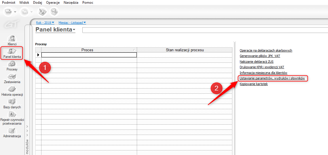 1. Uruchomić moduł Panel klienta, a następnie kliknąć opcję Ustawianie parametrów, wydruków i słowników.