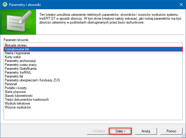 2. W oknie, które się wyświetli wybrać Formatowanie list i przejść Dalej.