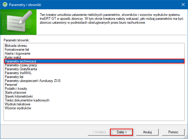 2. W oknie, które się wyświetli zaznaczyć Parametry archiwizacji i przejść Dalej.