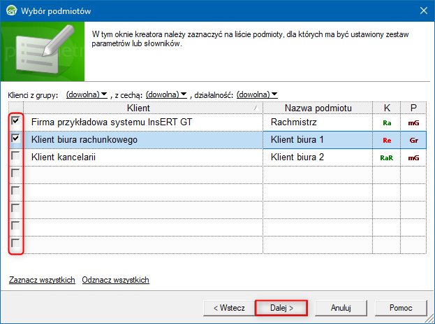 3. Zaznaczyć klientów, którym zostaną ustawione parametry archiwizacji i przejść Dalej.
