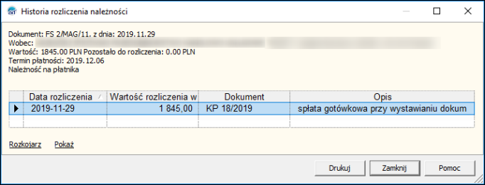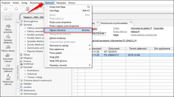 3. Aby sprawdzić, czy rozrachunek jest rozliczony, należy przejść do menu OperacjeHistoria rozliczenia, mając zaznaczony rozrachunek.