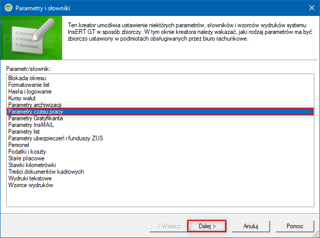 2. W oknie, które się wyświetli zaznaczyć opcję Parametry czasu pracy i przejść Dalej.