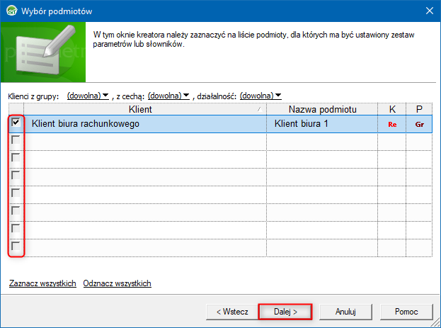 3. Zaznaczyć podmioty, w których zostaną ustawione parametry czasu pracy i przejść Dalej.