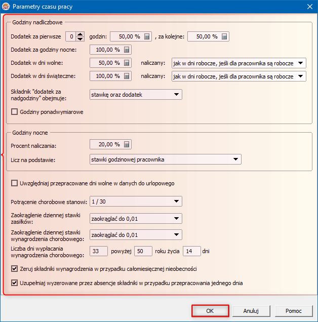 4. Po wyborze klientów pojawi się okno Parametry czasu pracy, gdzie należy wprowadzić wszystkie ustawienia. Kliknięcie przycisku OK rozpocznie ustawianie parametrów w podmiotach klientów biura rachunkowego.