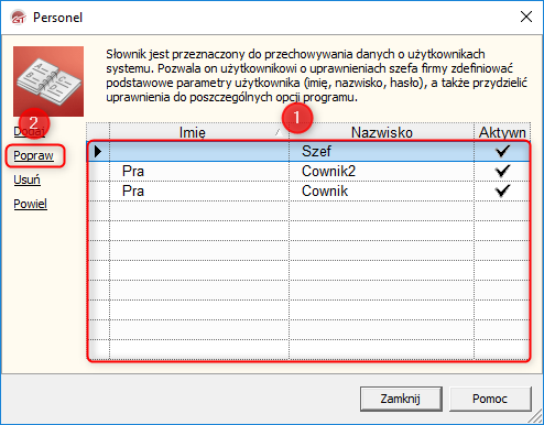 2. Następnie na liście użytkowników zaznaczyć tego, któremu uprawnienie usuwania pliku JPK będzie odebrane i kliknąć Popraw.