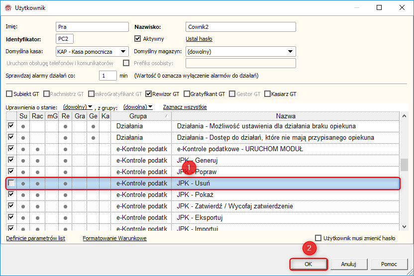 3. Na liście uprawnień odznaczyć parametr o nazwie: JPK - Usuń.