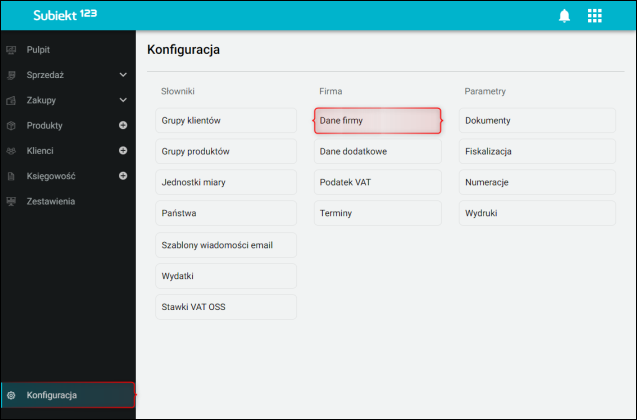 1. Przejść do modułu Konfiguracja – Dane firmy.