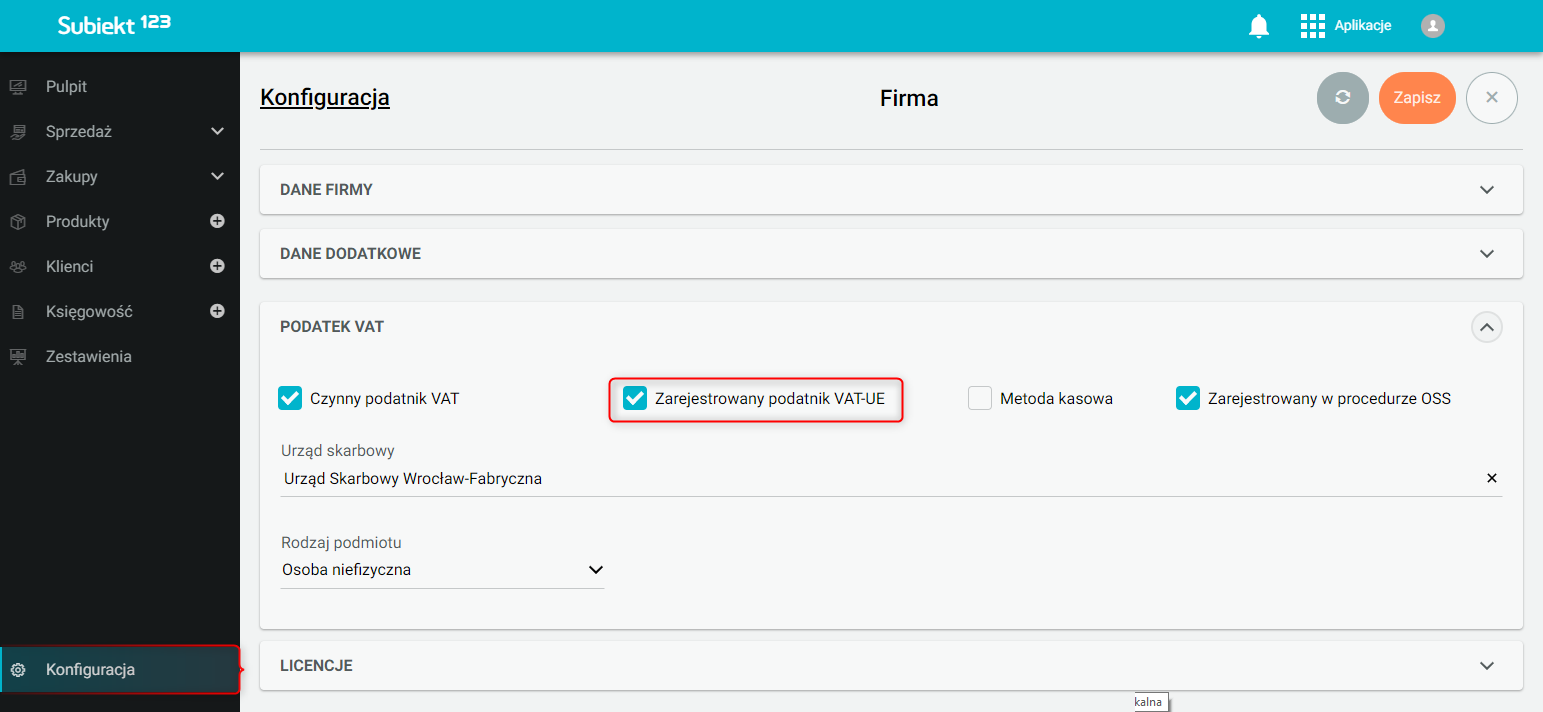 2. Rozwinąć sekcję Podatek VAT i zaznaczyć Zarejestrowany podatnik VAT-UE.