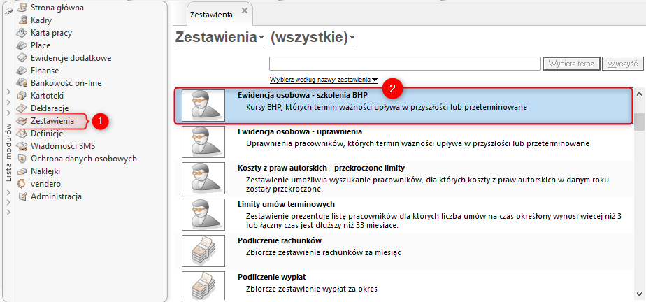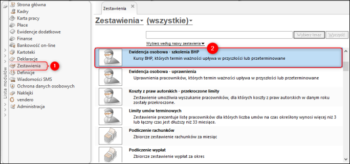1. Przejść do modułu Zestawienia i wybrać z listy Ewidencja osobowa - szkolenia BHP.