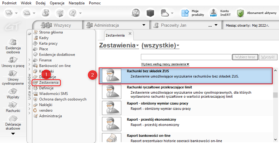 1. Przejść do modułu Zestawienia i wybrać z listy Rachunki bez składek ZUS.
