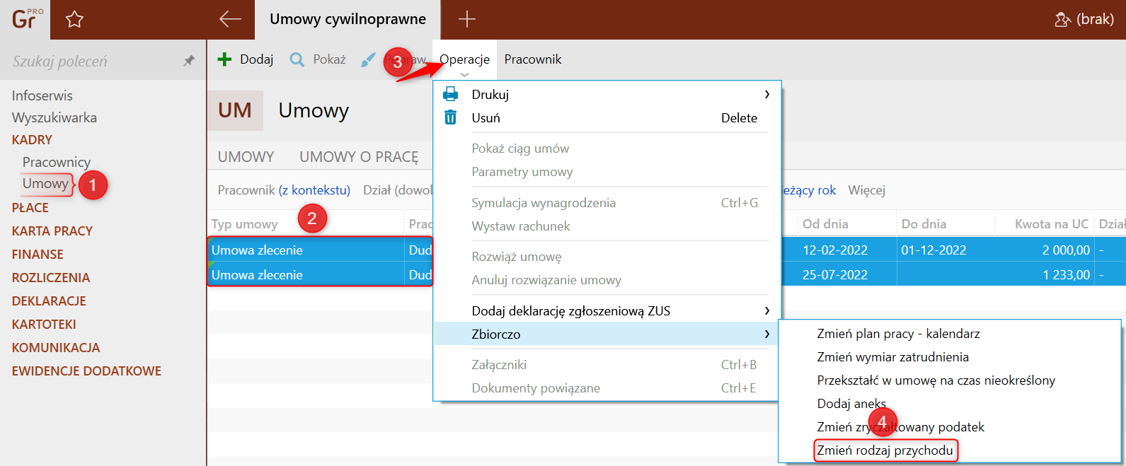 1. Przejść do modułu Kadry  Umowy na zakładkę Umowy cywilnoprawne i zaznaczyć wybrane umowy, z górnego menu wybrać Operacje  Zbiorczo  Zmień rodzaj przychodu.