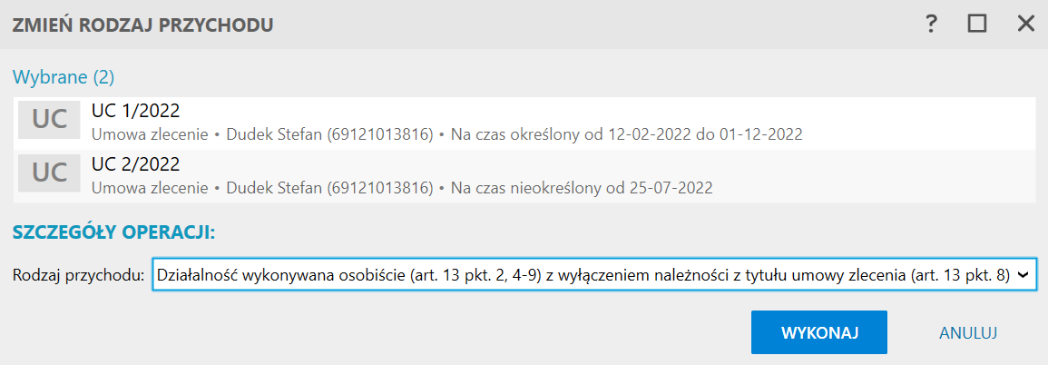 Aby zbiorczo zmienić rodzaj przychodu dla umów cywilnoprawnych, należy: