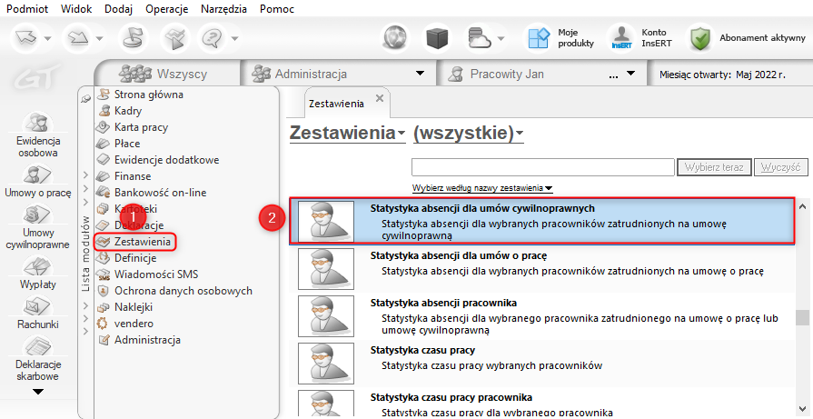 1. Przejść do modułu Zestawienia i wybrać z listy Statystyka absencji dla umów cywilnoprawnych.