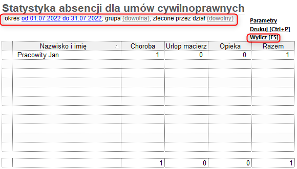 Aby wyliczyć zestawienie prezentujące statystykę absencji dla wybranych pracowników zatrudnionych na umowę cywilnoprawną, należy: