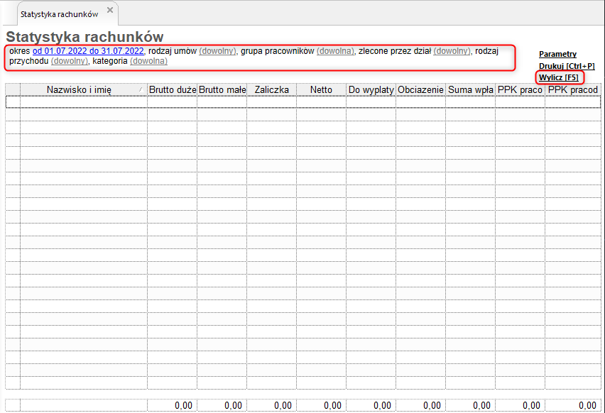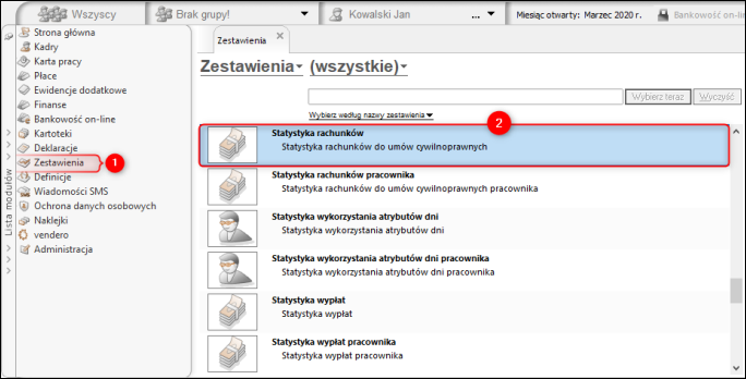 Aby wyliczyć zestawienie prezentujące statystykę rachunków do umów cywilnoprawnych, należy: