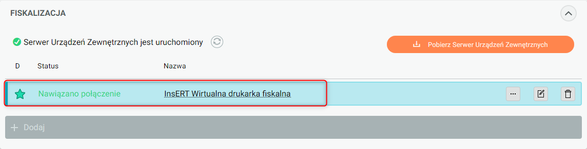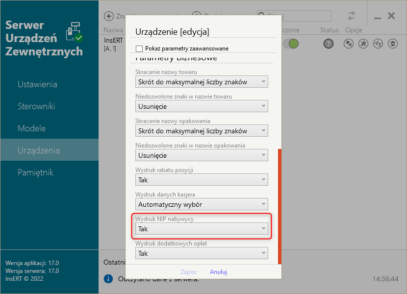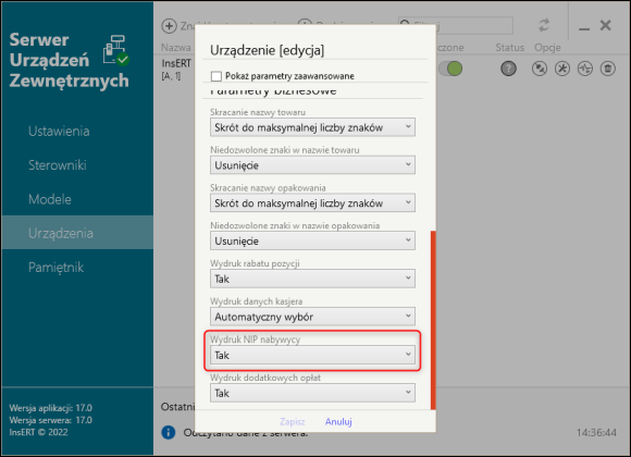 Na urządzeniu niewymagane są żadne zmiany. Jeżeli drukarka znajduje się na liście, to sterownik urządzenia go wydrukuje po zmianie konfiguracji. W tym celu należy przejść do Serwera Urządzeń Zewnętrznych (Aplikacja administracyjna SUZ) i w parametrach urządzenia ustawić Wydruk NIP nabywcy.