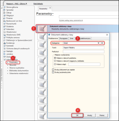 Aby zmienić domyślną kategorię dokumentu dla dokumentów odebranych z kasy, należy przejść do modułu Administracja – Parametry, odszukać i przejść do Dokumentów odebranych z kasy, a następnie na zakładce Podstawowe wskazać wybraną Kategorię. Przycisk + pozwala na dodanie nowej kategorii. Zmiany zatwierdzić przyciskiem OK.