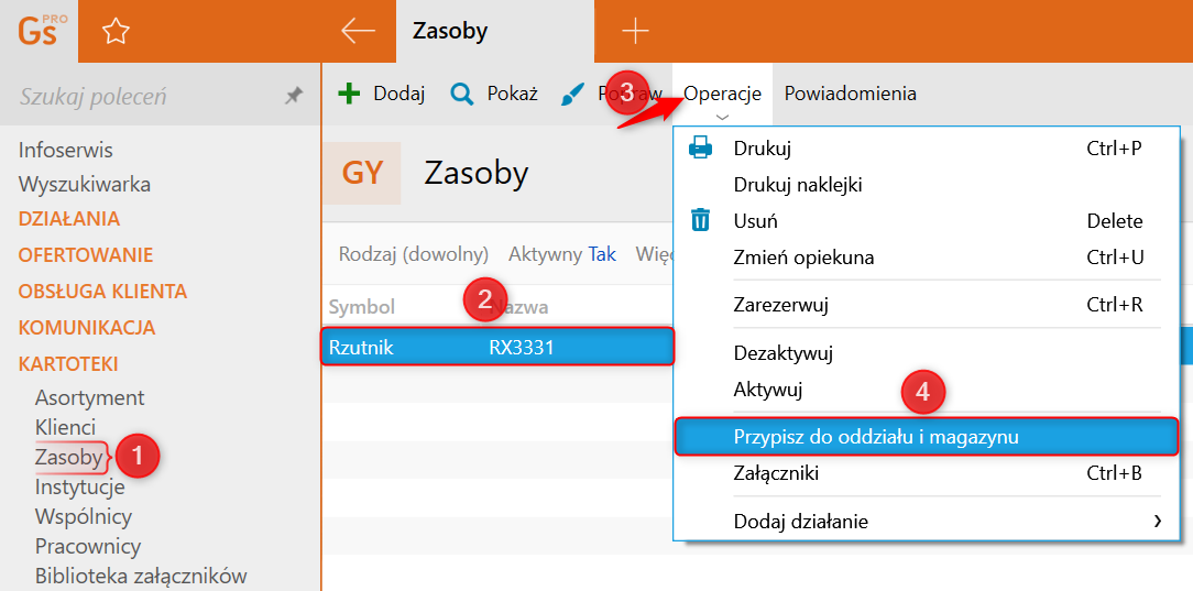 Aby to zrobić, należy przejść do modułu Zasoby, wybrać zasób, rozwinąć górne menu Operacje i wybrać Przypisz do oddziału i magazynu.