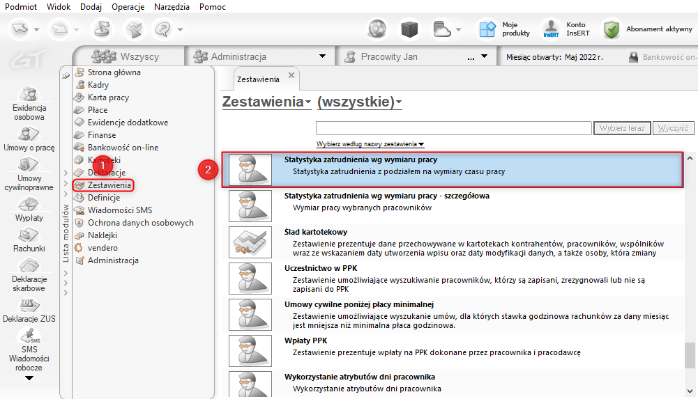 1. Przejść do modułu Zestawienia i wybrać z listy Statystyka zatrudnienia wg wymiaru pracy.
