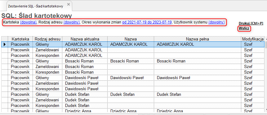 Aby wyliczyć zestawienie prezentujące dane przechowywane w kartotekach kontrahentów, pracowników, wspólników, wraz ze wskazaniem daty utworzenia wpisu oraz daty modyfikacji danych, a także osoby, która jej dokonała, należy: