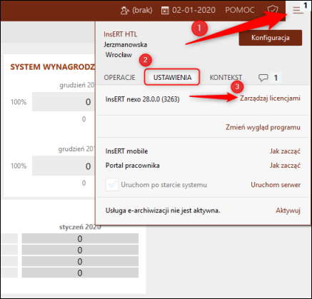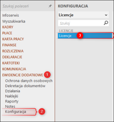 1. Wybrać menu rozwijane, przejść na zakładkę Ustawienia i wybrać Zarządzaj licencjami lub przejść do modułu Ewidencje dodatkowe – Konfiguracja – Licencje.